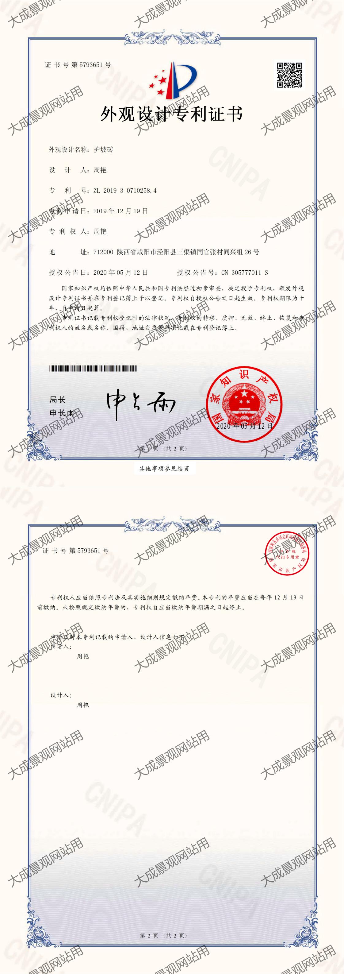 护坡砖专利证书